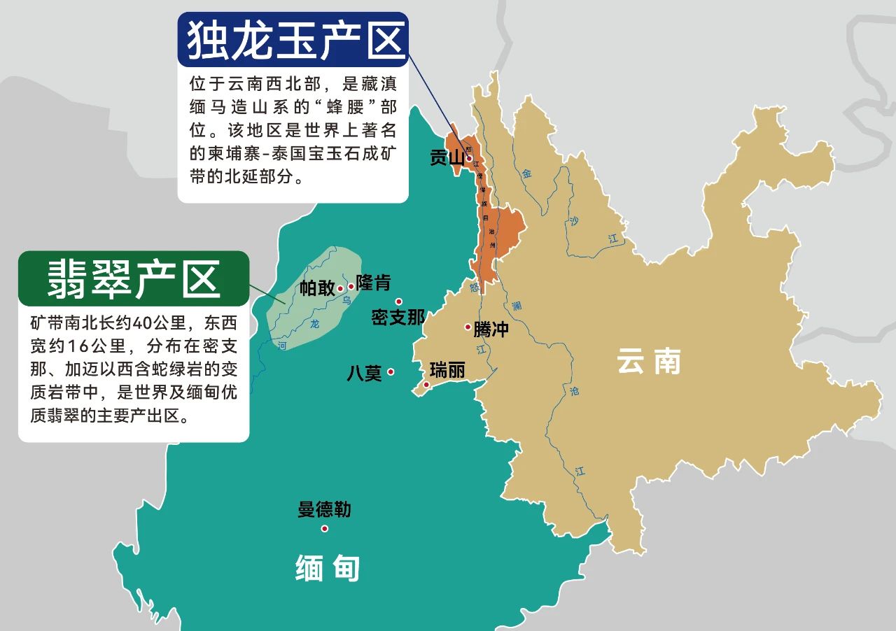 独龙玉,最早发现于中缅边境的独龙江流域,主要产自云南省怒江州贡山独龙族怒族自治县, 故得名“独龙玉”。该地区是藏滇缅马造山系的“蜂腰”部位,是世界上著名的柬埔寨-泰国宝玉石成矿带的北延部分, 分为高黎贡山宝玉石带、澜沧江宝玉石带和金沙江宝玉石带。据区域地质调查的最新资料, 贡山地区在侏罗-白垩纪曾发生过大规模的板块俯冲消减-对接碰撞作用。