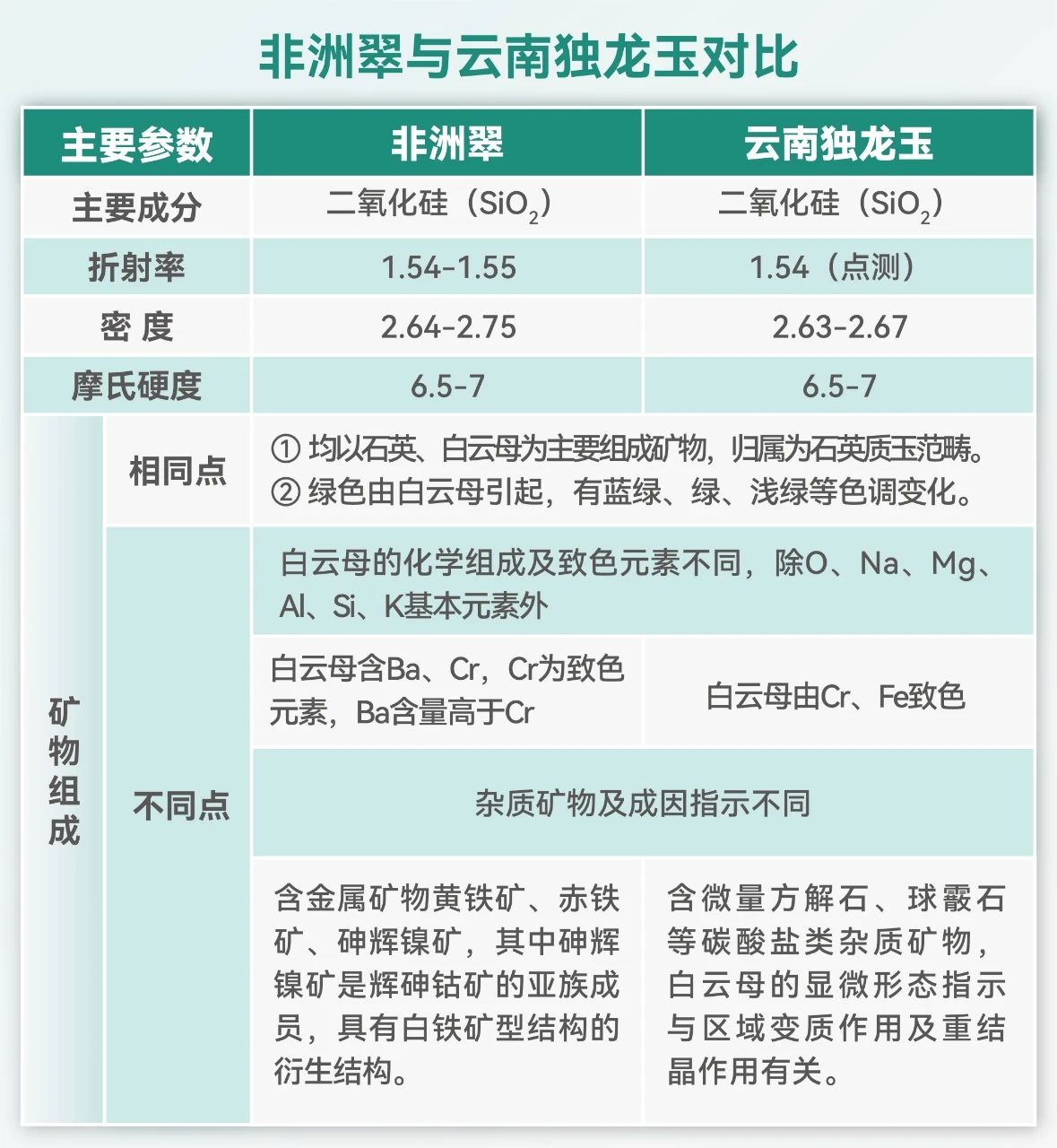 翡翠的主要矿物组成是以辉石类链状硅酸盐矿物为主,包括了硬玉、绿辉石和钠铬辉石等矿物。硬玉(NaAl[Si2O6])是组成翡翠的最主要成分,90%以上的翡翠主要是由硬玉矿物集合体组成的。非洲翠是石英质玉,主要组成矿物为α-石英(SiO2)。